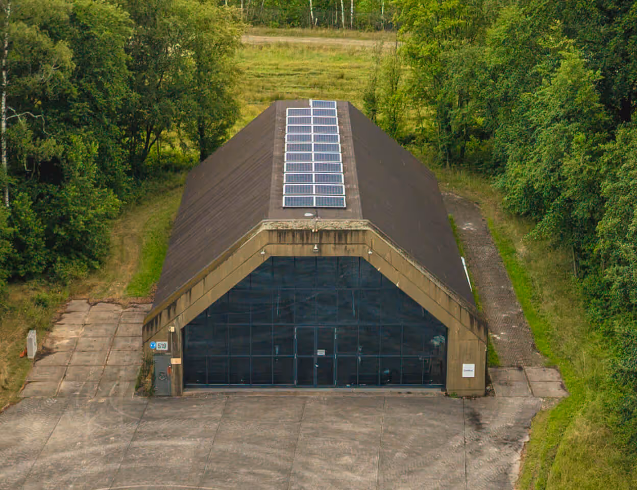 Voor alle shelters geldt, ongeacht de uiteindelijke gebruiksfunctie, dat zoveel mogelijkelementen van de F16-periode zichtbaar zijn gebleven, zoals de enorme stalen deuren dienog verzonken liggen in de betonnen vloer. Deze deuren werden vroeger gebruikt om deF16’s te beschermen tegen bombardementen. De behouden gebleven oudeshelterelementen vormen een mooi contrast met de moderne installatietechniek en degroene omgeving. De voorgevels zijn allemaal volledig van glas, waardoor je in elke shelterhet contrast zowel binnen als buiten ervaart. De door ons getransformeerde eerste shelterheeft aan de basis gestaan van de verbouw van alle shelters op Technology Base.